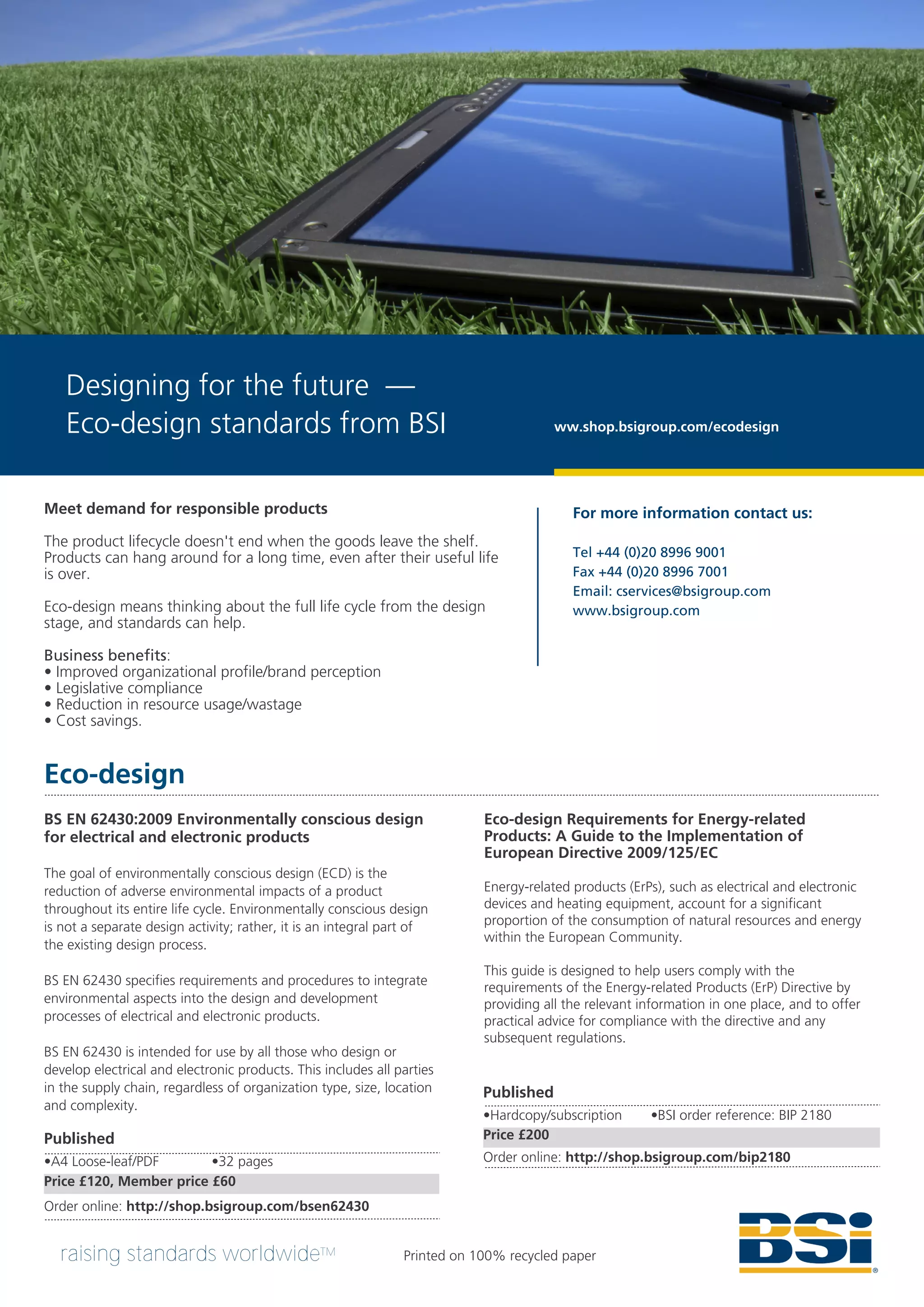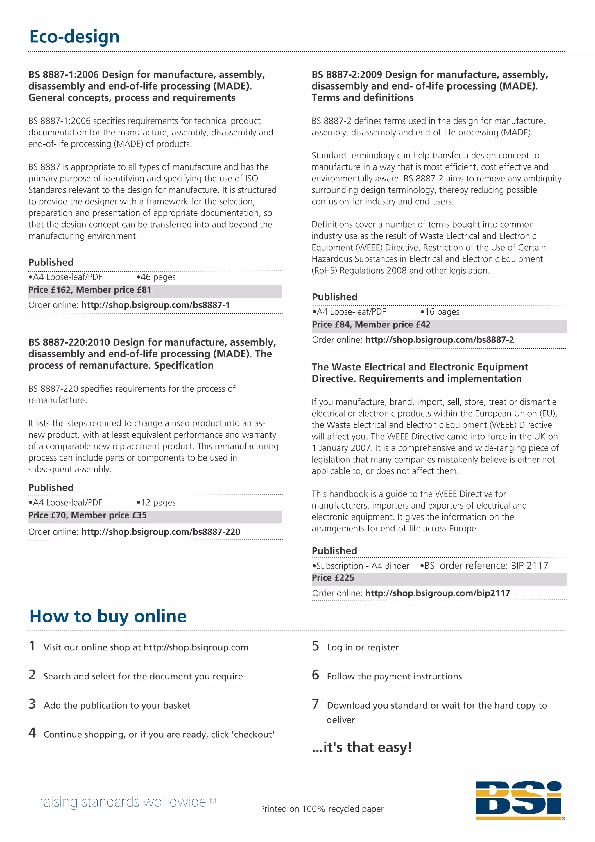 This document provides information on several British Standards relating to eco-design and sustainability. It discusses standards for environmentally conscious design of electrical products (BS EN 62430), design for manufacturing (BS 8887), and remanufacturing (BS 8887-220). It also mentions standards relating to terms and definitions (BS 8887-2) and implementation of the Waste Electrical and Electronic Equipment Directive. The document provides details on how to purchase the various standards online from the BSI group.