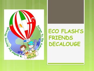 1. The document presents a decalogue, or 10 rules, for protecting the environment and reducing waste and pollution. The rules encourage recycling, reducing paper and plastic waste, using alternative transportation, and properly disposing of electronics.