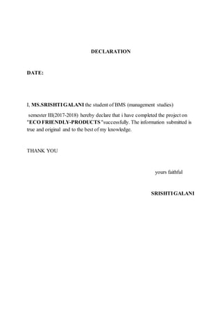 The document is a Bachelor's project on eco-friendly products, emphasizing their importance in nature conservation and the demand for organic and biodegradable materials. It outlines the role of manufacturers in creating environmentally conscious products and discusses various eco-friendly practices and materials, such as organic clothing and biodegradable plastics. The project aims to educate and promote awareness regarding environmental issues while highlighting the benefits of sustainable living.