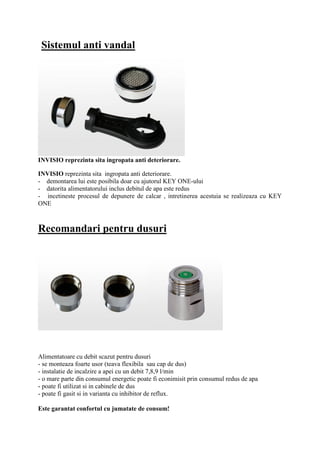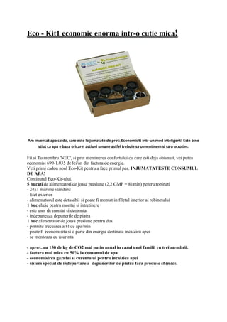 Eco-kit-ul oferit ajută la reducerea consumului de apă și energie, economisind între 690-1.035 de lei pe an. Acesta include alimentatori de joasă presiune, un sistem anti-calcar și un instrument de montaj, toate menite să îmbunătățească eficiența la utilizarea apei. Instalarea este simplă, iar beneficiile includ facturi mai mici și un impact redus asupra mediului.