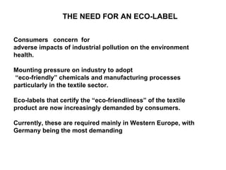 The document discusses the need for eco-labels in the textile industry. It notes that consumers are increasingly concerned about the environmental impacts of manufacturing and demand products certified as eco-friendly. Eco-labels help identify products made from environmentally safe materials without harmful chemicals. The document outlines several eco-label schemes and criteria around the world for textile certification.