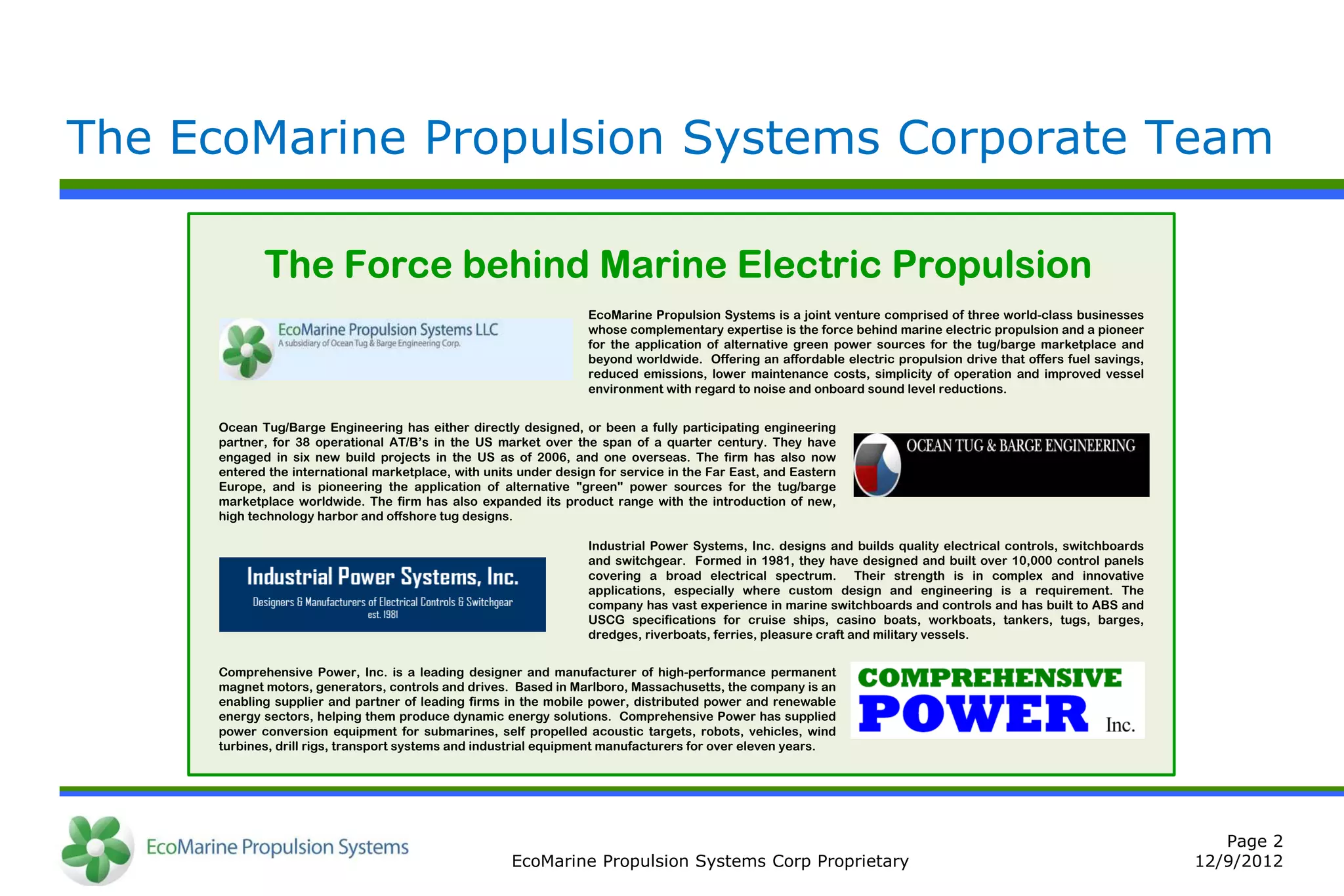 Ecomarine Propulsion Systems Corporation is a joint venture specializing in marine electric propulsion and the development of alternative green power sources for the tug/barge industry. They offer cost-effective propulsion systems that reduce emissions, fuel consumption, maintenance costs, and noise while enhancing operational efficiency. The company's technology includes innovative components such as Teratorq motors and generators, enabling advanced control and performance in various marine applications worldwide.