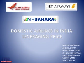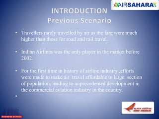 The document discusses the history and development of the airline industry in India. It describes how Indian Airlines was initially the sole player, but competition increased in the 1990s with the entry of Jet Airways and Air Sahara. All three airlines engaged in price wars in 2002 by cutting fares and introducing various promotional schemes to attract customers. This led to unprecedented growth in air travel accessibility for the Indian population.