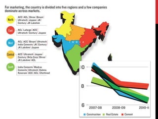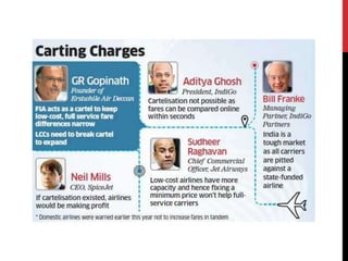 The document summarizes competition laws in India, including the MRTP Act and the Competition Act of 2002. It provides details on anti-competitive agreements, abuse of dominant position, regulation of combinations, and the role of the Competition Commission of India. It also briefly discusses cases involving the cement industry, airlines industry, and automobile industry. Competition laws in the US and UK are also summarized at a high level.
