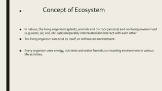 The document discusses ecosystems, defining them as interconnected systems of living organisms and non-living components that interact. It describes the key components of ecosystems - abiotic (non-living) factors like water, air, minerals; and biotic (living) factors like producers, consumers, and decomposers. The two main types of ecosystems are aquatic (marine and freshwater) and terrestrial (forests, deserts, grasslands, mountains). Forest ecosystems are further divided into tropical and temperate rainforests, deciduous forests, taiga, etc. The ecosystem is a dynamic system formed by interactions between its living and non-living parts.
