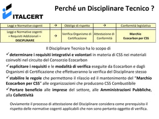 Il documento descrive il disciplinare tecnico per il rilascio del marchio 'ecocarbon per css', mirato a definire requisiti integrativi nel settore dei combustibili secondari. Italcert svolgerà la validazione del disciplinare, stabilendo regole chiare e obiettivi per garantire la corretta prassi produttrice e il rispetto delle normative vigenti. L'obiettivo è promuovere la crescita del mercato, tutelare l'ambiente e sviluppare risorse per il settore e la collettività.