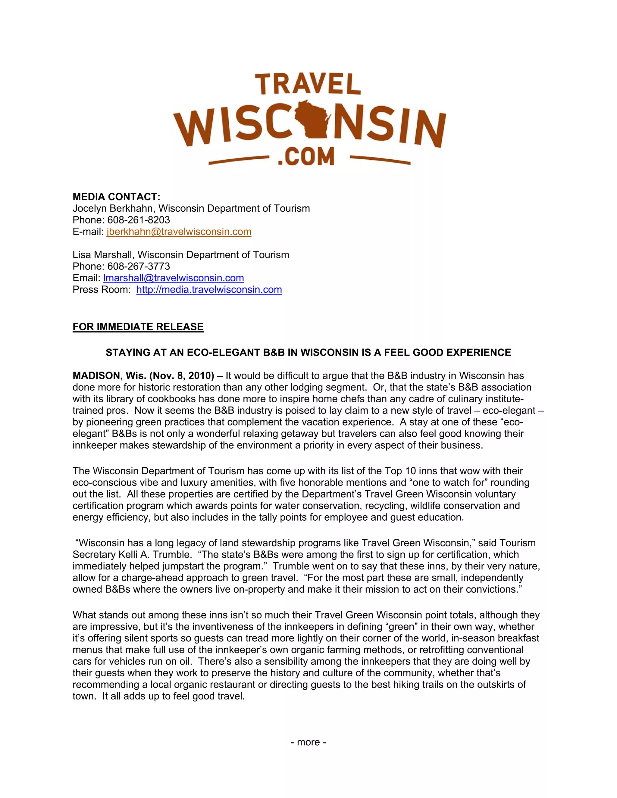 This document provides a list and descriptions of the top 10 eco-elegant bed and breakfast inns in Wisconsin as determined by the Wisconsin Department of Tourism. It describes each inn's green practices and certifications. The inns focus on sustainability through practices like energy efficiency, use of local and organic foods, and promoting outdoor recreation. They provide feel-good travel experiences while protecting the environment. The document recommends other green businesses and activities for travelers to visit in each inn's local area.