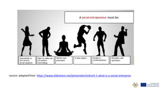This document provides information on social commercial entrepreneurship. It defines social entrepreneurship and compares it to traditional entrepreneurship. Social entrepreneurship aims to create social value rather than profit alone. The document outlines key principles of social entrepreneurship such as having a social mission and involving stakeholders. It also discusses the characteristics of successful social entrepreneurs, including innovation, leadership, and persistence. Finally, it provides details on relevant EU and national legislation regarding social entrepreneurship.