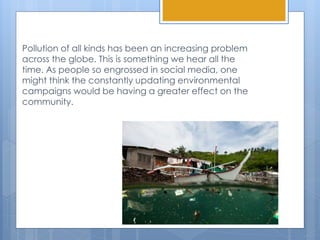 This document discusses a community clean up event being organized in Palm Coast to address the problem of increasing pollution. The event aims to have community members help pick up trash in heavily polluted areas. Participants will be divided into groups and assigned sections to clean. They will be provided with gloves and bags and there will be drivers for efficient trash disposal. Further details will be provided to recruited volunteers. The goal is to have a positive environmental impact through a little community effort.