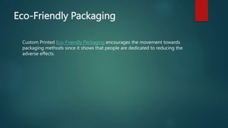 The document discusses eco-friendly packaging, emphasizing the importance of custom printed options. It highlights the commitment to reducing negative environmental impacts through sustainable packaging methods. Overall, it advocates for eco-friendly practices in packaging.