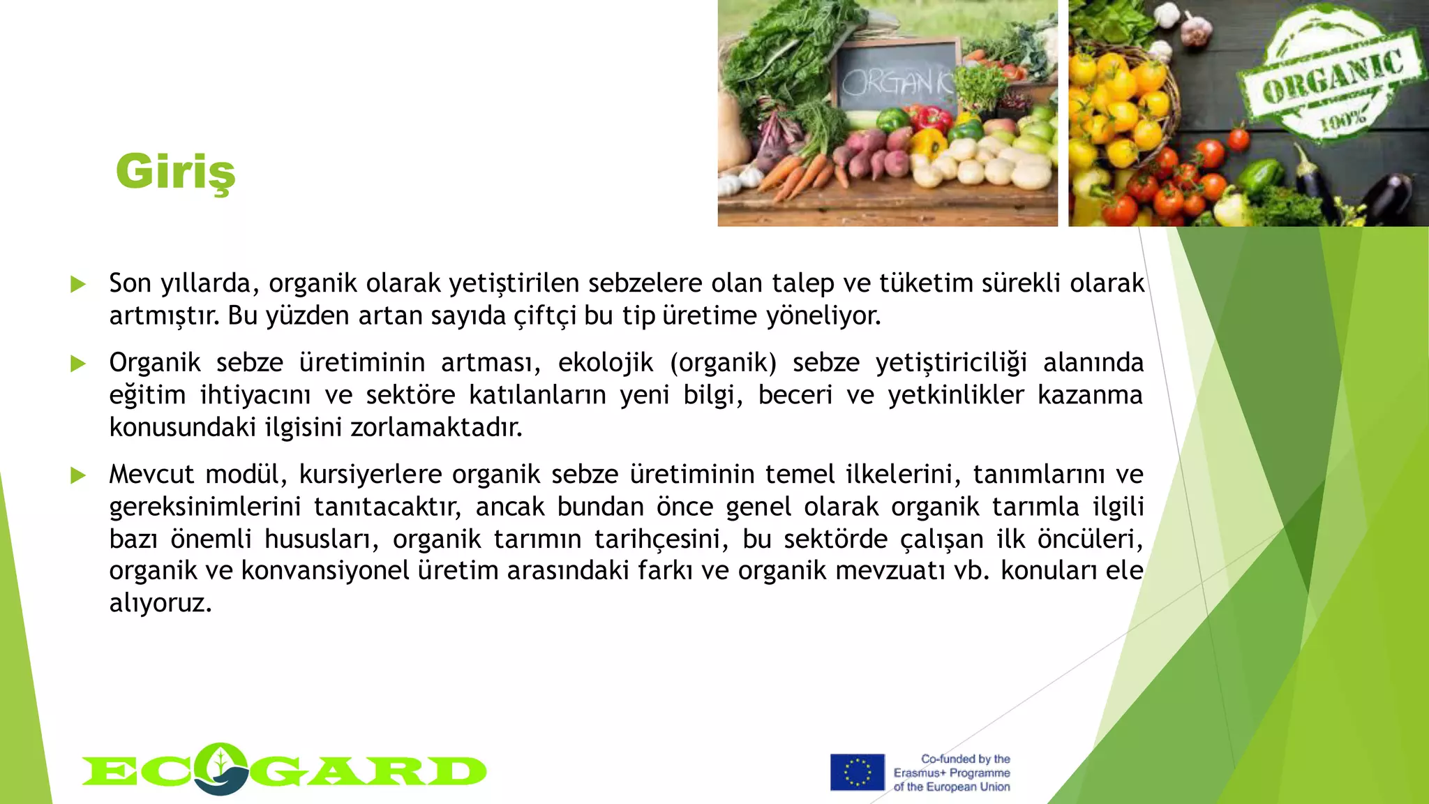 Mevcut modül, kursiyerlere organik sebze üretiminin temel ilkelerini, tanımlarını ve
