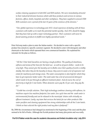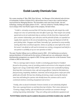 The case discusses the challenges faced by Archimedes Ventures Limited (AVL) in achieving sales targets for Ecolab's laundry chemicals in India, following an initial enthusiasm for the partnership established in 2002. By 2004, AVL struggled to sell Ecolab's products due to their high prices compared to competitors, leading to a demotivated sales force and concerns about losing the partnership. The document highlights the need for strategic reconsideration to overcome the current negative situation and avoid reputational damage.