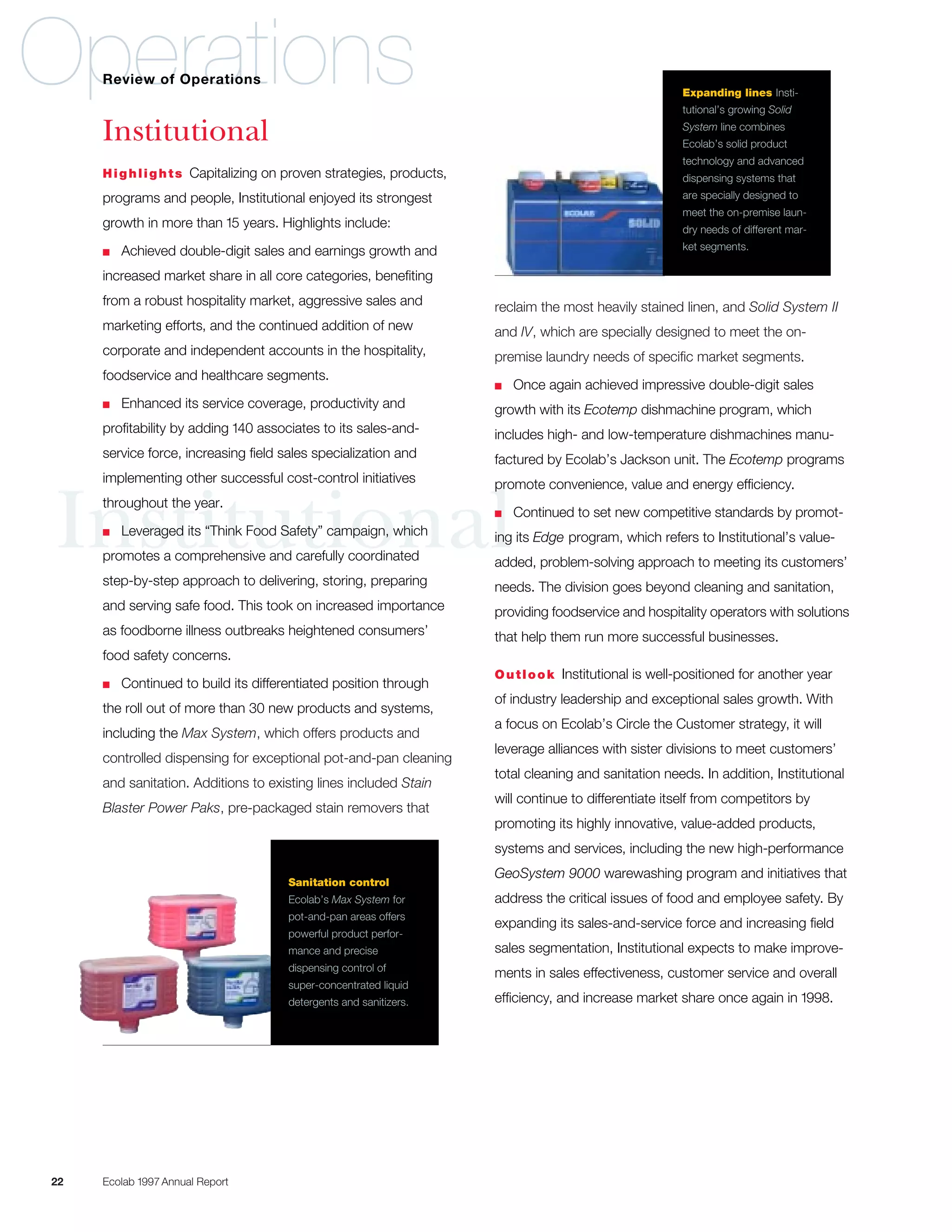 Institutional enjoyed strong double-digit growth in sales and earnings in 1997. Key factors included achieving increased market share across core categories through aggressive sales and marketing, adding new hospitality and healthcare accounts, and enhancing service coverage. Water Care Services completed integrations and positioned itself for growth by introducing innovative programs and expanding industry presences. Food & Beverage achieved record results through growth in non-dairy markets, new food processing business, and emphasizing a total systems approach.
