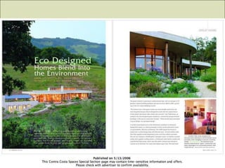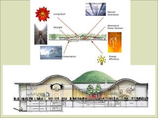 The document discusses several principles of ecological design including environmental ethics, the triple bottom line of social equity, environmental impact, and financial reward. It provides examples of green building projects like Dockside Green in Vancouver, BC, which used brownfield redevelopment, vegetated systems, wastewater reuse, and renewable energy. Other case studies discussed include the Harvard Blackstone Renovation and the California Academy of Sciences roof habitat project. Design criteria for ecological reference, balanced capacity, and sustainable yield are also outlined.