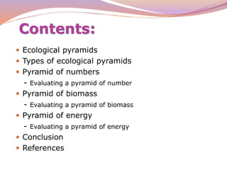 The document discusses ecological pyramids which are graphical representations of trophic structures in ecosystems, detailing three types: pyramid of numbers, pyramid of biomass, and pyramid of energy. It highlights their evaluations, advantages, and disadvantages, emphasizing the significance of these pyramids in understanding ecosystem dynamics and energetics. The conclusion underlines their role in observing changes within ecosystems and references various ecological sources.