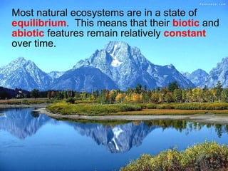 Ecological succession describes the process by which the species in an ecosystem change over time following a disturbance. It can be primary succession, which occurs on new surfaces like lava flows with no previous life, or secondary succession, which follows a disruption but not destruction of an existing community like after a forest fire. Succession proceeds as pioneering species like grasses establish and modify the environment, making it possible for other plants like shrubs and trees to grow and eventually form a stable community. Examples of succession include forests reestablishing on the island of Krakatoa after its 1883 eruption destroyed all life and sand dunes transforming into forests over time along shorelines.