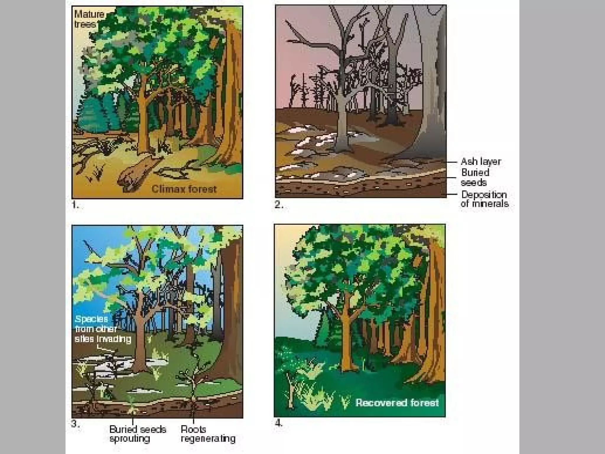 Ecological succession describes how communities change over time through primary and secondary succession. Primary succession occurs in areas without soil, like new bare rock, where pioneer species establish and slowly transform the rock into soil over long periods. Secondary succession follows a disruption, like a forest fire, where the original community regrows through different stages. Mature communities tend to have greater biodiversity and are dominated by climax species well-adapted to the local environment. Cycles of matter, like carbon and nitrogen, are essential to life and involve exchanges between living things and their environment.