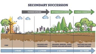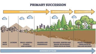 Ecological succession is the process of change in the species structure of a community over time. It occurs through primary succession on new surfaces like lava flows, and secondary succession after disturbances in previously colonized areas. Pioneer species are the first to colonize new habitats, contributing nutrients to soils through decomposition. Over time, the community develops towards a climax community adapted to the local climate and geography, which will persist until disrupted by disturbances.