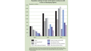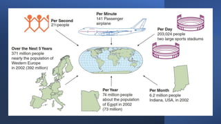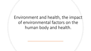 This document discusses the relationship between the environment and human health. It defines key terms like environment and ecological model of health. It then discusses the history of environmental health from ancient times to the present, covering topics like occupational health, major figures like John Snow and Walter Reed, and key events like the 1848 British Public Health Act. It also discusses current frameworks like Healthy People 2020 and issues like climate change, vulnerable subgroups, environmental risks in developing countries, population growth, urbanization, and the epidemiological and demographic transitions.