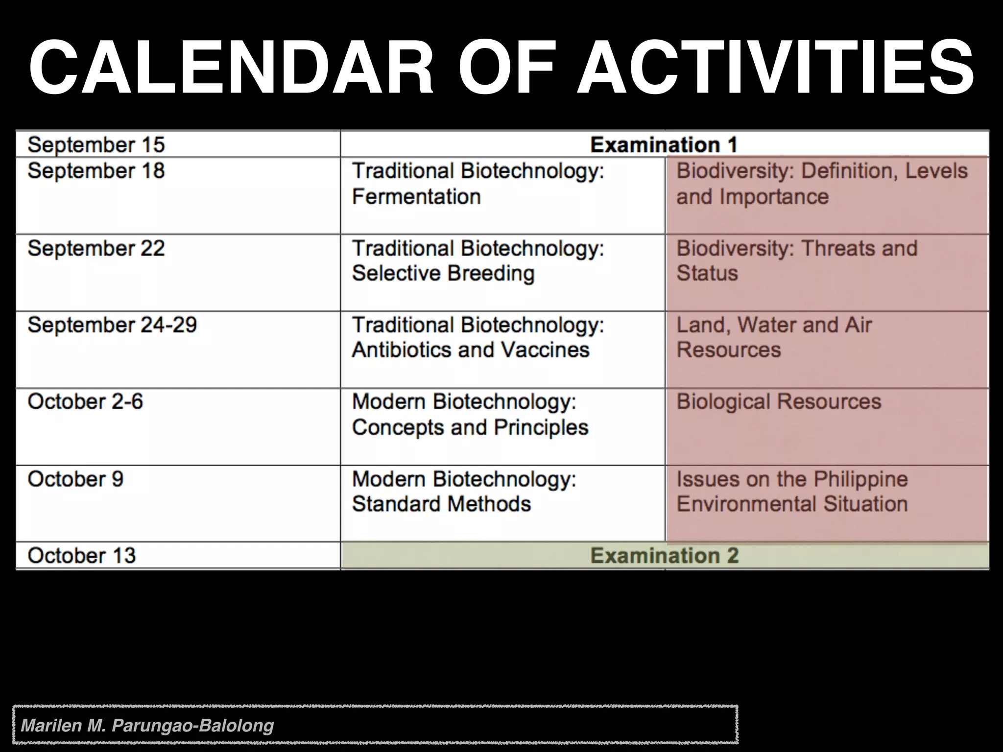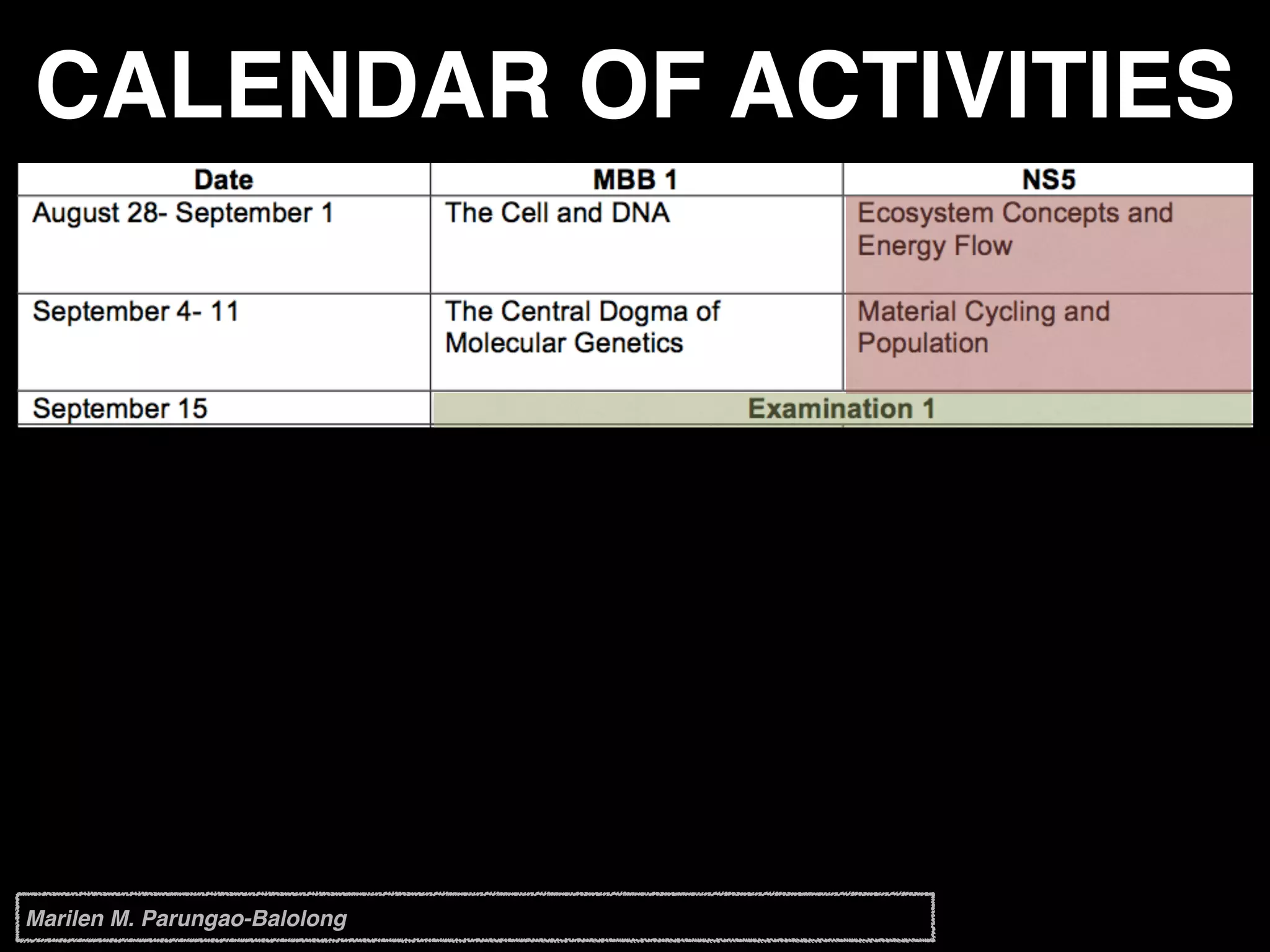 The document contains a calendar of activities for Marilen M. Parungao-Balolong covering topics such as calendar of activities, energy concepts and energy flow, ecology, ecosystem concepts, and energy flow, with each topic containing multiple entries attributed to Marilen M. Parungao-Balolong.