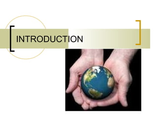 The document discusses ecology, environment, and sustainable development. It defines key terms like ecology, environment, and sustainable development. It then discusses some of the major environmental problems facing humanity, like global warming. Global warming is caused by increased greenhouse gases like carbon dioxide and methane from human activities. This is trapping more heat in the lower atmosphere and causing issues like melting ice caps and changes to climate and habitats worldwide. The document ends by suggesting some individual actions people can take to help address these environmental challenges.
