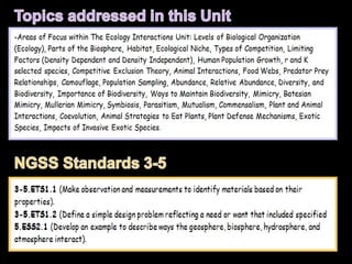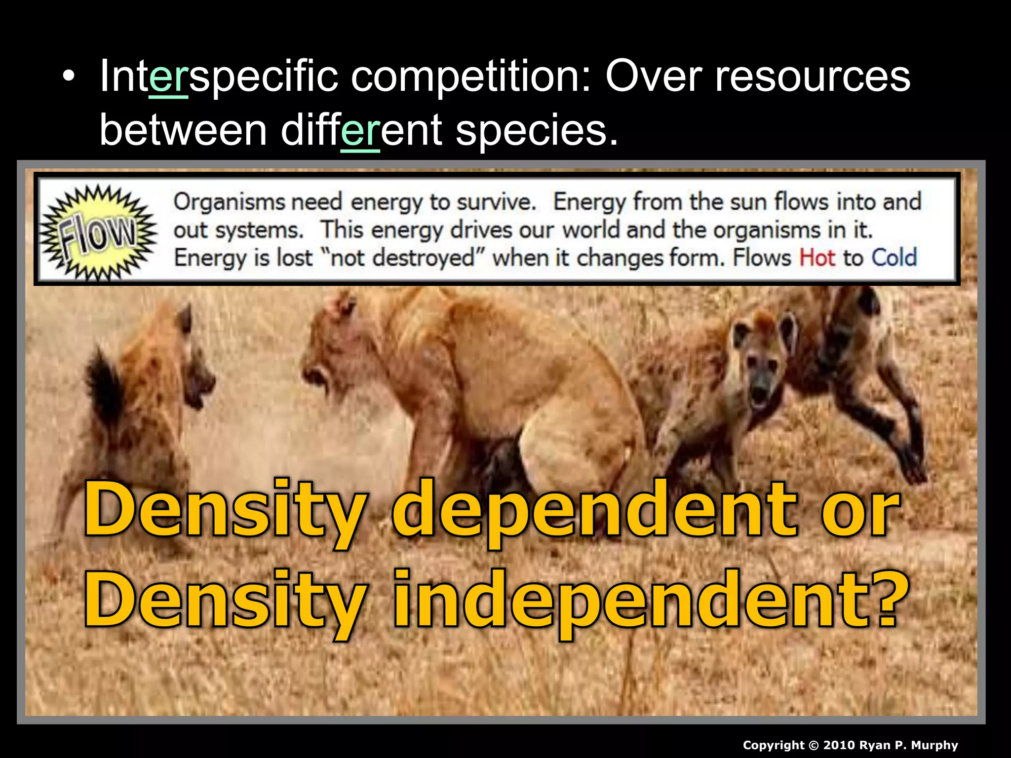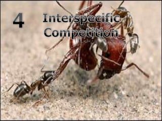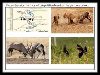 The document discusses competition in ecology, specifically interspecific and intraspecific competition among species for resources. It covers concepts such as competitive exclusion theory, types of competition, and includes activities designed to demonstrate these principles through simulations involving bird species competing for seeds. Additionally, it emphasizes the importance of recording observations and completing quizzes related to the material presented.