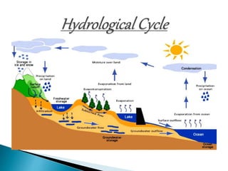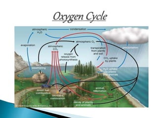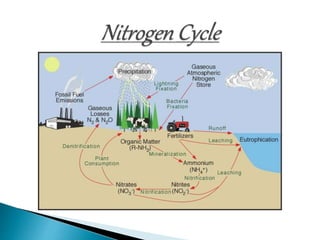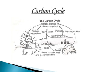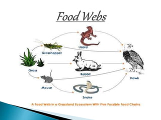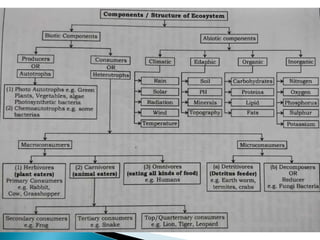 The document defines ecology and describes various ecological concepts and components. Ecology is defined as the scientific study of the interactions between organisms and their physical environment. It discusses the components of different ecosystems including producers, consumers, decomposers and their interactions through food chains, food webs and nutrient cycles. Major ecosystem types described are forests, grasslands, deserts, freshwater and marine systems.