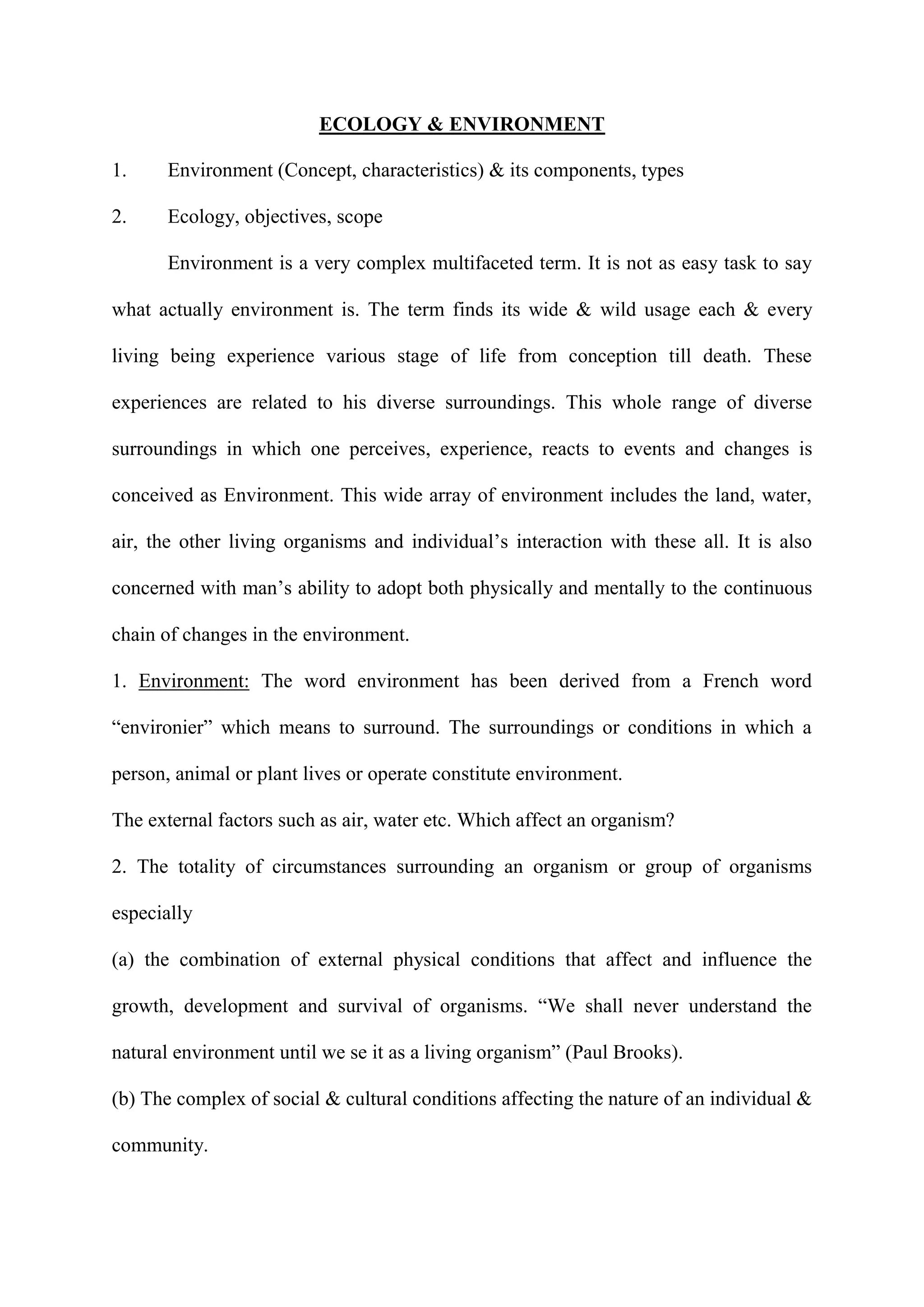 The document discusses the key components of the environment - abiotic, biotic, and energy. It defines environment as the sum of living and nonliving things that surround an organism. The abiotic component includes the lithosphere (physical space), atmosphere (climate), and hydrosphere (water). The biotic component refers to living or organic elements. Energy from the sun powers the environment and drives ecological processes and cycles.