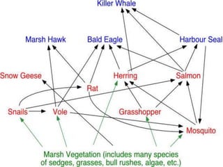 Ecology is the scientific study of interactions between organisms and their environments, focusing on energy transfer. It examines the relationships between organisms and their biotic (living) and abiotic (non-living) environmental factors. Ecosystems consist of interconnected food webs and nutrient cycles that transfer energy between producers, consumers, and decomposers across multiple trophic levels. Disruptions to these relationships, such as the biological magnification of toxins up food chains, can significantly impact populations and ecosystems.