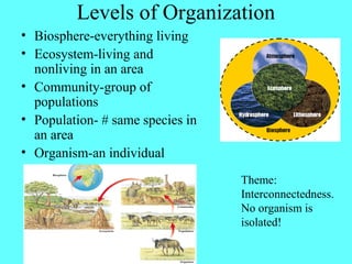 The document discusses various concepts in ecology including the levels of ecological organization from the biosphere to organisms and the interconnectedness of all living things. It covers topics like population dynamics, growth models, limiting factors, species interactions through competition and mutualism, ecological succession, energy flow through ecosystems, and the major biomes found around the world. The overall theme is the complex relationships and interactions between organisms and their environments.
