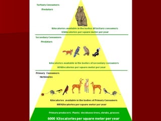 3) Energy and nutrients cycle through food chains, webs, and pyramids from producers to consumers to decomposers. Key