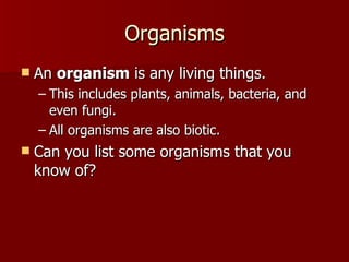 1) Organisms include plants, animals, bacteria and fungi. A population is a group of the same species in an area. A community includes all populations in an area that depend on each other.