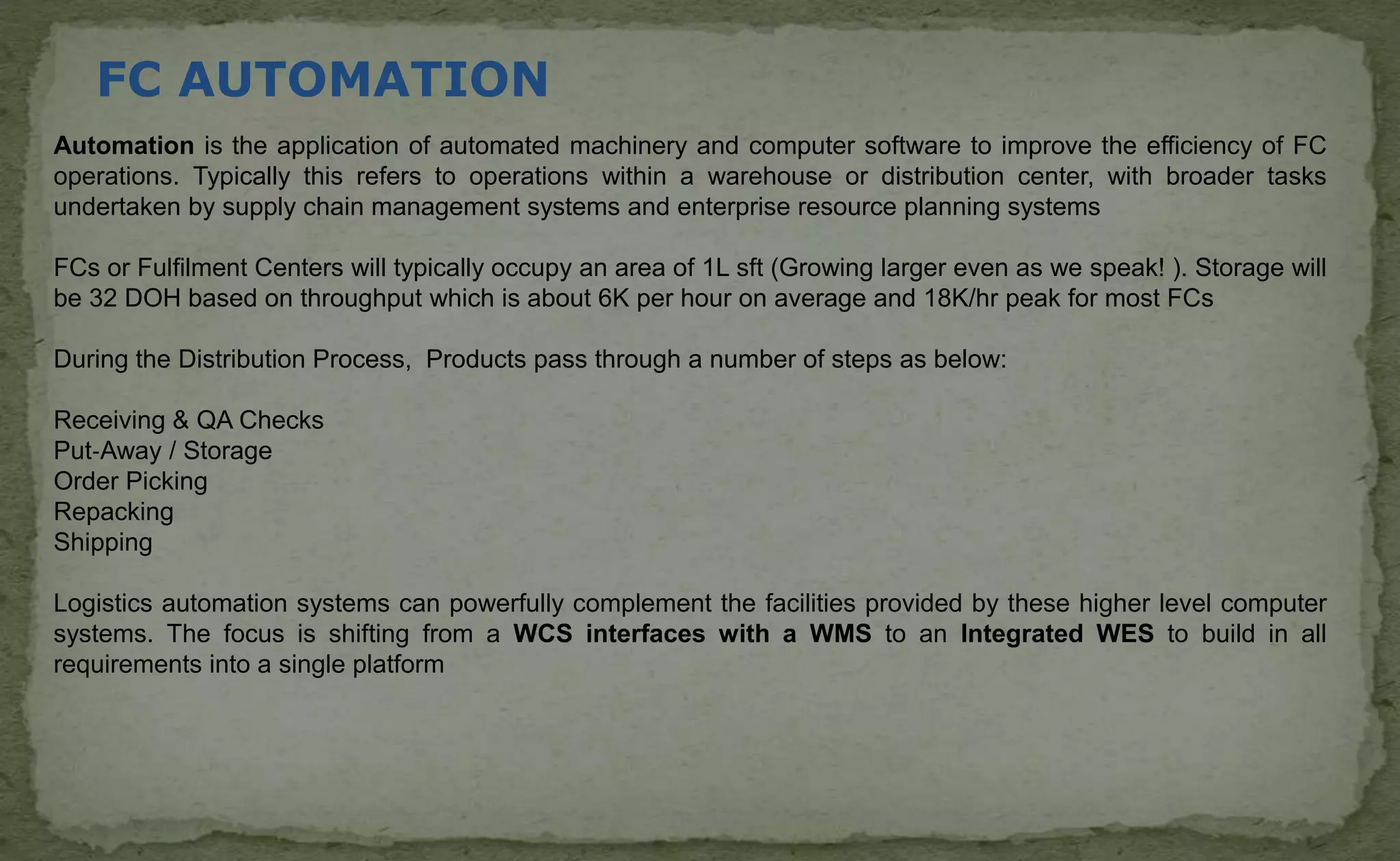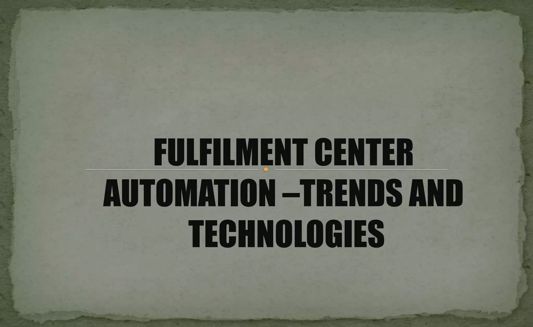 This document discusses automation trends and technologies for fulfillment centers. It begins by defining fulfillment center automation and describing the typical distribution process. The main drivers for automation are outlined as optimizing costs, addressing space constraints, improving order picking efficiency, ensuring business continuity, and addressing health and safety regulations. Examples of automated technologies discussed include conveyor systems, automated dock loading/unloading, storage solutions like mini-load AS/RS, and sorting systems. Overall automation is presented as a way to reduce costs, improve productivity and scalability, and address labor issues through reducing dependency on manual work.