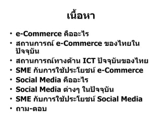 เนื้อหา e-Commerce คืออะไร สถานการณ์ e-Commerce ของไทยในปัจจุบัน สถานการณ์ทางด้าน ICT ปัจจุบันของไทย SME กับการใช้ประโยชน์ e-Commerce Social Media คืออะไร Social Media ต่างๆ ในปัจจุบัน SME กับการใช้ประโยชน์ Social Media ถาม - ตอบ