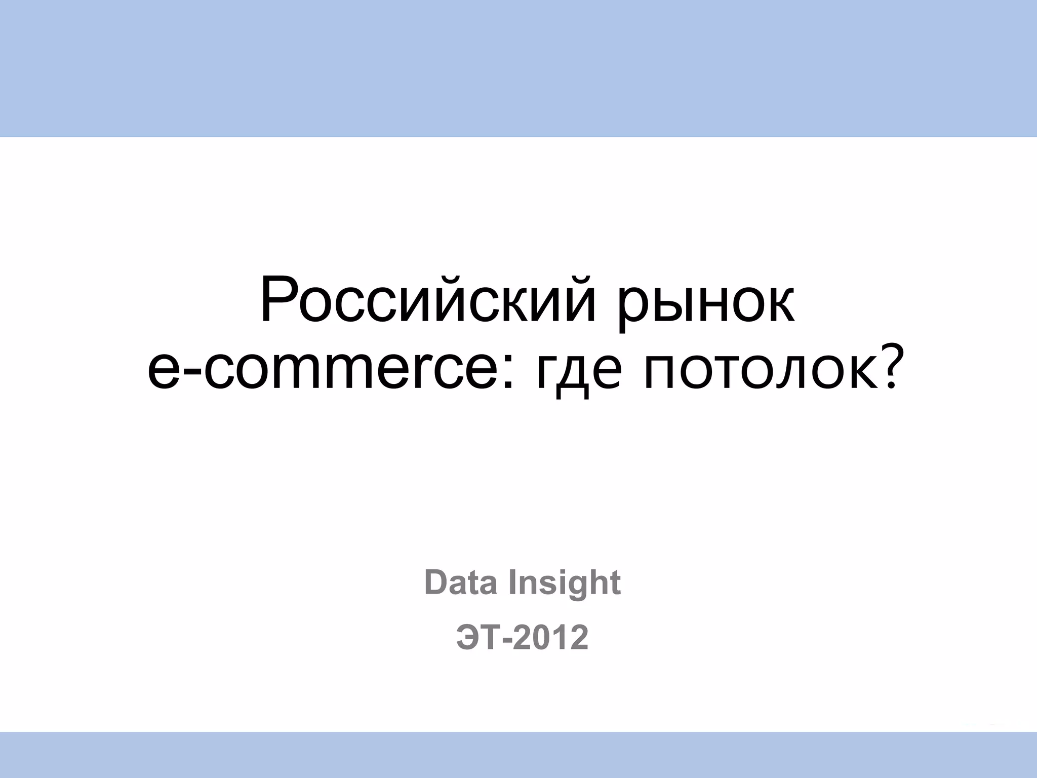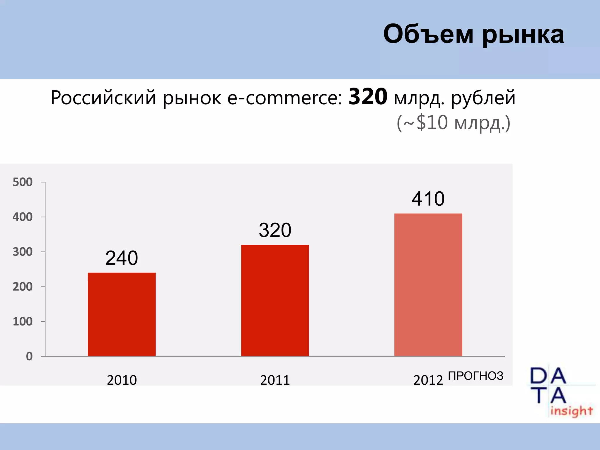 Российский рынок e-commerce в 2012 году оценён в 320 млрд. рублей, с замедляющимися темпами роста, ожидаемыми на уровне 28% по сравнению с предыдущим годом. Основными драйверами роста остаются увеличение доли онлайн-покупающих и рост интернет-аудитории, однако факторы, способствующие росту пользователей, уже близки к исчерпанию. Будущее развитие требует новых сервисов и активного вовлечения пользователей в онлайн-шопинг для повышения частоты и стоимости покупок.