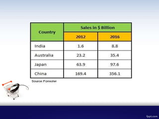 Ecommerce is defined as using electronic communication and digital information to conduct business transactions. The document discusses the types of ecommerce including business-to-business, business-to-customer, customer-to-customer, and business-to-government. It also outlines essential factors for ecommerce growth in India such as cash on delivery, replacement options, feedback, tracking orders, and multiple payment options. The sectors discussed include retailers like Flipkart, as well as travel, matrimonial services, job searching, and online ads. Opportunities exist for retailers, sellers, and individuals, while challenges include logistics, cyber crimes, and tax collection. The future of ecommerce is predicted to include increased use of smartphones