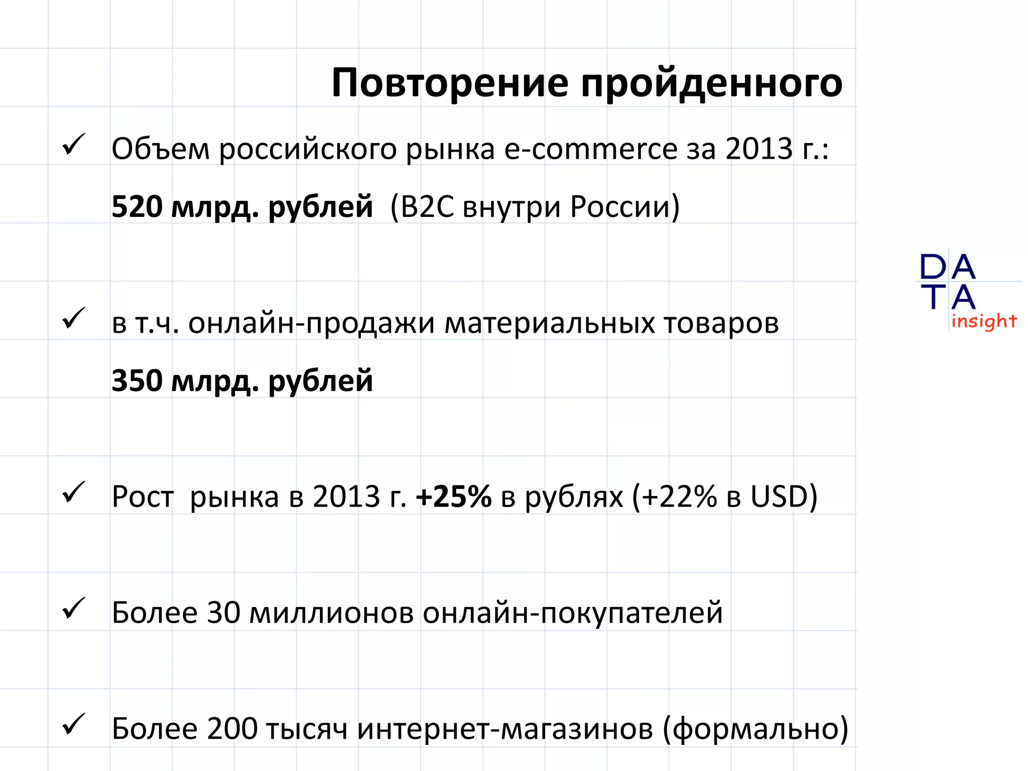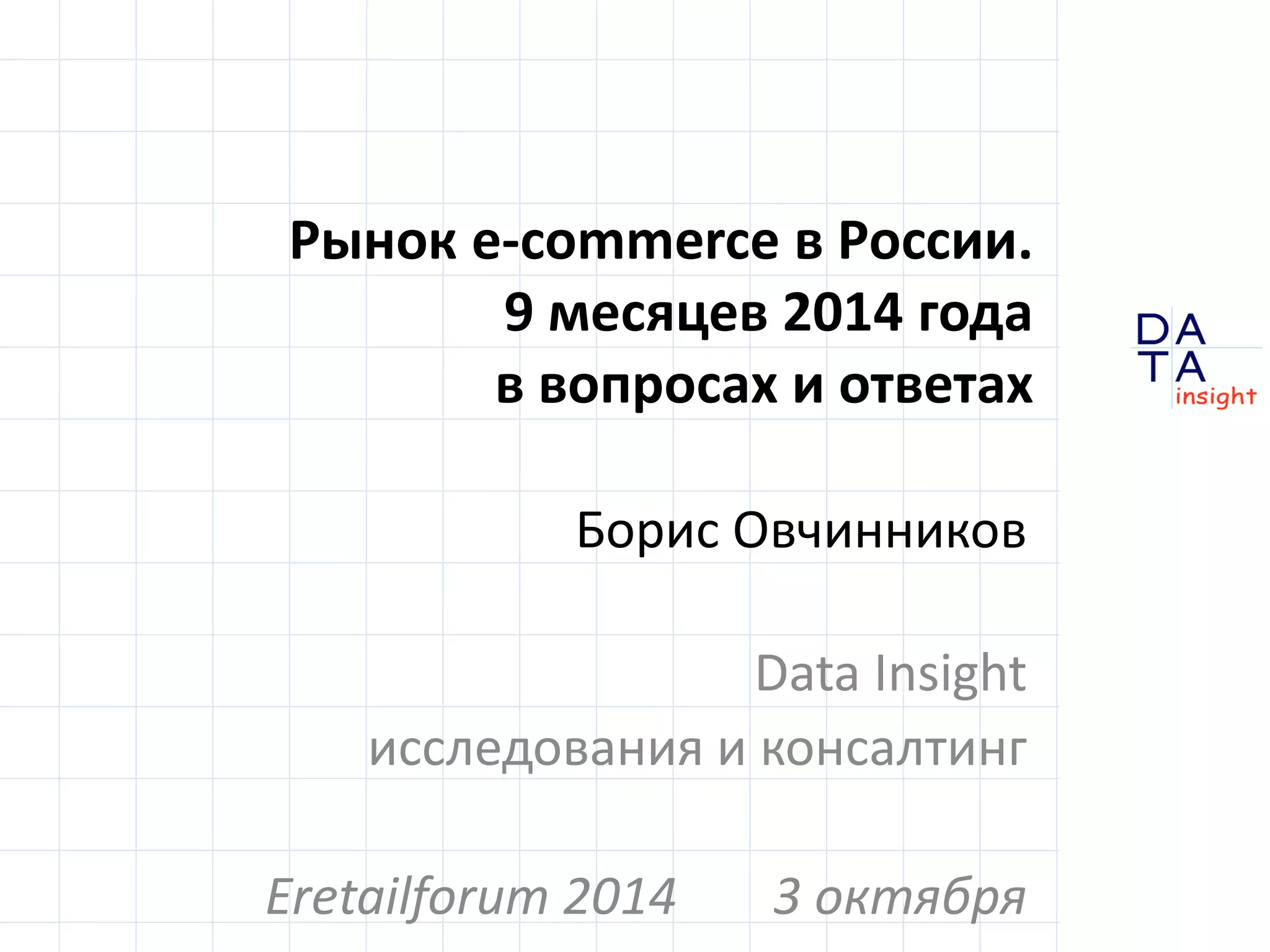 Документ анализирует состояние и динамику рынка e-commerce в России за 2013 и 2014 годы, указывая на объем рынка в 520 млрд рублей и его значительный рост. В нем также освещается стагнация посещаемости интернет-магазинов, несмотря на увеличение количества онлайн-покупок и конверсии. Специфика роста рынка связывается с увеличением среднего чека и влиянием крупных игроков.