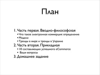 Документ представляет собой план курса по электронной коммерции, охватывающий основные модели, тренды и ключевые компоненты успешного ecommerce. В нем рассматриваются важные аспекты, такие как трафик, платформа, безопасность и логистика, а также содержится домашнее задание с задачами по анализу свойств для успешного бизнеса в этой области. В конце документа приведены вопросы для обсуждения и рекомендации по дальнейшему чтению.
