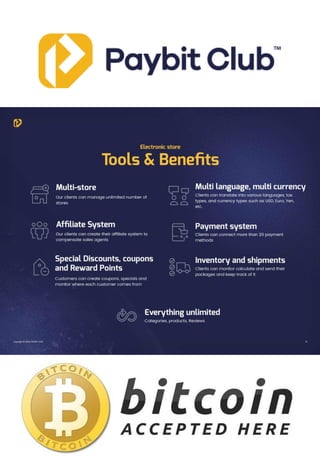 This document advertises a service that claims to allow funds to be sent directly to accounts without a middle man in an anonymous and time/cost efficient manner. It states the goal is to protect privacy by not requiring any personal information from merchants and that the service never touches the merchant's bitcoin, instead forwarding it automatically from sender to receiver's wallet. It also promotes the ability to generate income from cryptocurrency fees through a lifetime license link, virtual toolkit, and daily profit sharing pools.
