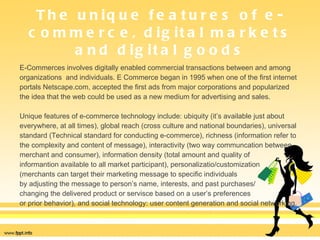 E-commerce involves digital transactions between organizations and individuals. Unique features include ubiquity, global reach, customization, and social networking. Digital markets have reduced costs and more transparency. Digital goods can be delivered over networks at low cost. There are three main types of e-commerce: business-to-consumer, business-to-business, and consumer-to-consumer. Principal models include retailers, brokers, market creators, and content providers generating revenue from advertising, sales, subscriptions, and transactions. Building successful e-commerce requires understanding objectives and selecting appropriate technology.