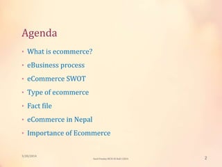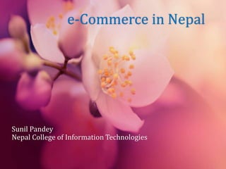The document discusses e-commerce in Nepal. It provides definitions of e-commerce and examples. It then discusses the importance of e-commerce for Nepal, noting that its large young population and growing mobile market present opportunities. However, infrastructure challenges like reliable internet and delivery services must still be addressed. Payment options in Nepal are also discussed, including emerging options like mobile and web-based payments through systems like eSewa.