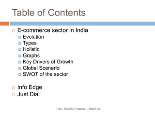 The document discusses the evolution of e-commerce in India and provides an overview of the e-commerce sector. It analyzes key drivers of growth for the sector such as increased internet usage and favorable demographics. The document also discusses major companies in the e-commerce space, including Info Edge and Just Dial, providing details on their business models, financial performance, and SWOT analyses. Graphs and comparisons with global markets are presented to showcase India's potential for future e-commerce growth.