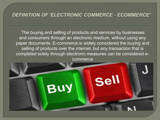 The document discusses e-commerce, defining it as transactions of products and services conducted electronically without physical documents, primarily over the internet. It outlines similarities and differences between e-commerce and traditional commerce, including customer expectations and security measures. Additionally, it touches on merchant services related to electronic payment processing and various cryptography standards relevant to secure digital transactions.