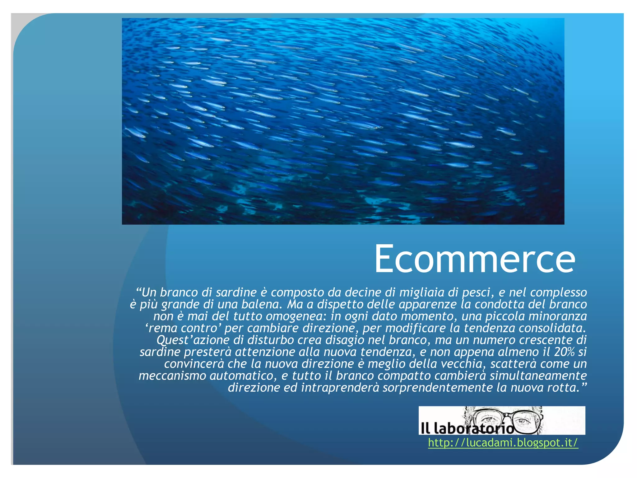 Il documento evidenzia la crescita dell'ecommerce a livello globale, con picchi notevoli in Nord America e Europa, e sottolinea la necessità di adattamento delle aziende italiane a questo fenomeno. Solo il 25% delle piccole e medie imprese italiane possiede un sito web, compromettendo le loro opportunità di crescita nel mercato globale. Inoltre, l'emergere del 'research online, purchase offline' indica un cambiamento significativo nelle abitudini di acquisto, spingendo le imprese a sfruttare l'ecommerce per migliorare l'accessibilità dei prodotti italiani.