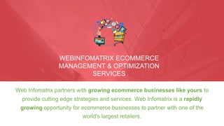 Webinfomatrix offers ecommerce management and optimization services to help businesses grow their online presence and increase revenue by partnering with major retailers. Their client-focused approach includes personalized campaign design and extensive marketplace management services. The company is committed to clear communication and exceeding client expectations throughout the process.