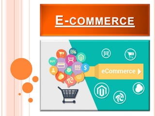 This document discusses e-commerce and its various types and aspects. It begins with introducing commerce and e-commerce. It then outlines the objectives of e-commerce like high reachability, conversions, customer satisfaction, and social popularity. The methodology section explains different types of e-commerce like B2B, B2C, B2E, and C2C. It also discusses topics like advantages and disadvantages of e-commerce and customer intimacy. The document presents findings from a study and provides recommendations to improve e-commerce adoption. It concludes that e-commerce has significantly grown the economy by changing consumer purchasing behavior.