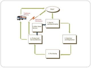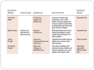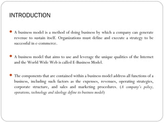 The document discusses e-commerce business models, outlining seven unique features that define an e-business model including value proposition, revenue model, market opportunity, competitive environment, competitive advantage, market strategy, and organizational development. It then describes the multistage model for e-commerce consisting of search and identification, selection and negotiation, purchasing electronically, product delivery, and after-sales service. Finally, it lists some major business-to-consumer and business-to-business e-commerce business models.