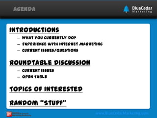 The document outlines an agenda for a Minneapolis Marketing Authority meeting focusing on internet marketing experiences, current issues, and roundtable discussions. It includes details on individual backgrounds in internet marketing, particularly in eCommerce and SEO, and highlights current projects such as buyeyeglasses.com and its features aimed at increasing prescription sales. Additionally, it discusses Google's social platform Google+ and its components for sharing content and connecting with users.
