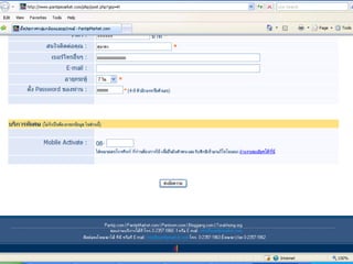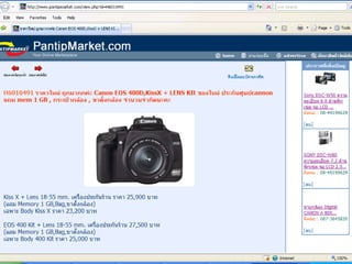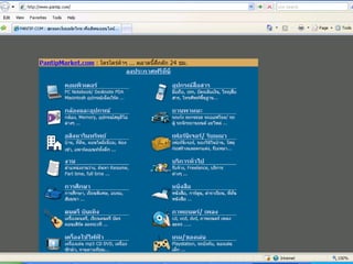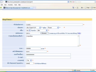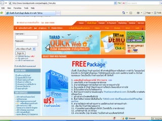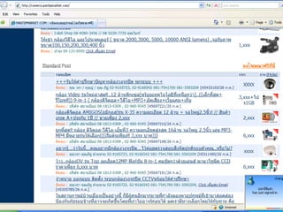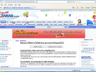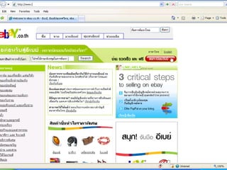 Ecommerce start 1. 2. 3. 4. 5. หลักสำคัญ 5 ประเด็น Business Process Service Learning Collaboration Community 6. คุณลักษณะสำคัญของ E-commerce 1. Ubiquity 2. Global Reach 3. Universal Standard 4. Richness 5. Ineractive 6. Information Density 7. personalization/ Customization 7. กรอบแนวคิดของพาณิชย์อิเล็กทรอนิกส์ กรอบแนวคิดของพาณิชย์อิเล็กทรอนิกส์ประกอบด้วย 4 ส่วนใหญ่ ๆ คือ แอพพลิเคชั่นของพาณิชย์อิเล็กทรอนิกส์ ปัจจัยทางการบริหาร โครงสร้างพื้นฐาน ประเภทสินค้าของพาณิชย์อิเล็กทรอนิกส์ 8. 9. การพัฒนาเว็บไซต์ กำหนดโครงสร้างของเว็บไซต์ว่าจะมีอะไรบ้าง เช่น Homepage, Company Profile,Product and Service, FAQ, Contact เป็นต้น กำหนดรูปแบบของเว็บไซต์และเว็บเพจว่าภาพโดยรวมเป็นอย่างไร กำหนดวิธีการอธิบายลักษณะสินค้า และบริการให้สมบูรณ์ กำหนดราคาสินค้า ( บาทและดอลลาร์สหรัฐฯ ) ราคารวมค่าขนส่ง / ประกันภัย / ภาษี ลงรายละเอียดของร้านค้าที่ลูกค้าจะติดต่อได้ กำหนดและระบุนโยบายการคืนสินค้า 10. การรับและบริหารการสั่งซื้อ ระบบการสั่งซื้อ ( Odering System) ระบบการชำระเงิน ( Payment System) วิธีที่สะดวกที่สุดคือการรับชำระเงินผ่านบัตรเครดิต ยืนยันคำสั่งซื้อ บรรจุสินค้าเพื่อทำการจัดส่ง วิธีการส่งต้องรวดเร็วและสะดวก โดยเสนอทางเลือกให้ลูกค้าด้วย 11. 3. ช่วงเวลาใดที่เหมาะสมสำหรับการเริ่มต้นธุรกิจพาณิชย์อิเล็กทรอนิกส์ เมื่อคุณสำรวจตัวเองแล้วพบว่ามีศักยภาพและความพร้อมเพียงพอ อย่าลังเลรีรอ การเข้าสู่ระบบนี้ได้เร็วเท่าไหร่ย่อมหมายถึงว่าเวลาและโอกาสที่จะใช้ในการเรียนรู้และปรับตัวก็มีมากขึ้นเท่านั้น ซึ่งเมื่อถึงเวลาที่ทั่วโลกพร้อม คุณก็จะพร้อมแล้วเช่นกัน ผู้ใช้อินเทอร์เน็ตมีอัตราการเติบโตที่รวดเร็วทำให้การกระจายข่าวบนชุมชนอินเทอร์เน็ตทำได้รวดเร็ว ซึ่งย่อมเป็นผลดีแก่ผู้บุกเบิกหรือริเริ่มอะไรใหม่ๆ เพราะจะได้รับการกล่าวถึงเป็นอย่างมาก ทำให้ได้เปรียบในเรื่องของชื่อเสียงและภาพพจน์ของบริษัท 12. 4. การทำพาณิชย์อิเล็กทรอนิกส์ต้องใช้เงินลงทุนเบื้องต้นมากน้อยเพียงใด ขึ้นอยู่กับปัจจัยหลายๆประการ เช่น ขนาดและความซับซ้อนของเว็บไซต์ แผนการตลาดและประชาสัมพันธ์ งบประมาณหลักๆที่จำเป็นต้องมีไว้ในกรณีที่ต้องการมีเว็บไซต์เป็นของตนเอง คอมพิวเตอร์ ซอฟต์แวร์ ค่าจ้างในการทำเว็บไซต์ ค่าดูแลรักษาเว็บไซต์ และ ค่าโฆษณา โดยรวมแล้วอยู่ประมาณหลักแสนถึงล้านบาท อย่างไรก็ดีสำหรับผู้มีเงินทุนน้อย ไม่เพียงพอสำหรับวิธีนี้ ทางเลือกอื่นก็มี เช่น การสร้างเว็บไซต์บน Free Homepage หรือ การเข้าไปร่วมเป็นส่วนหนึ่งในไซเบอร์มอลล์ ( Cyber Mall) ซึ่ง สองแบบหลังนี้ใช้เงินทุนน้อยกว่า เพราะไม่ต้องเสียค่าใช้จ่ายในส่วนของ ค่าซอฟต์แวร์ ค่าจ้างแรงงาน หรือ ค่าดูแลรัก