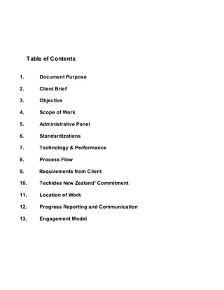 This document outlines the scope of work for developing an ecommerce website. It includes details on website features like customer registration and login, searching and viewing products, placing and tracking orders, and an admin backend interface. The objectives are to develop a cost-effective and high quality website using technologies like CSS, XHTML, and AJAX. The scope of work covers designing templates and layouts, building frontend and backend interfaces, and integrating payment and shipping gateways.
